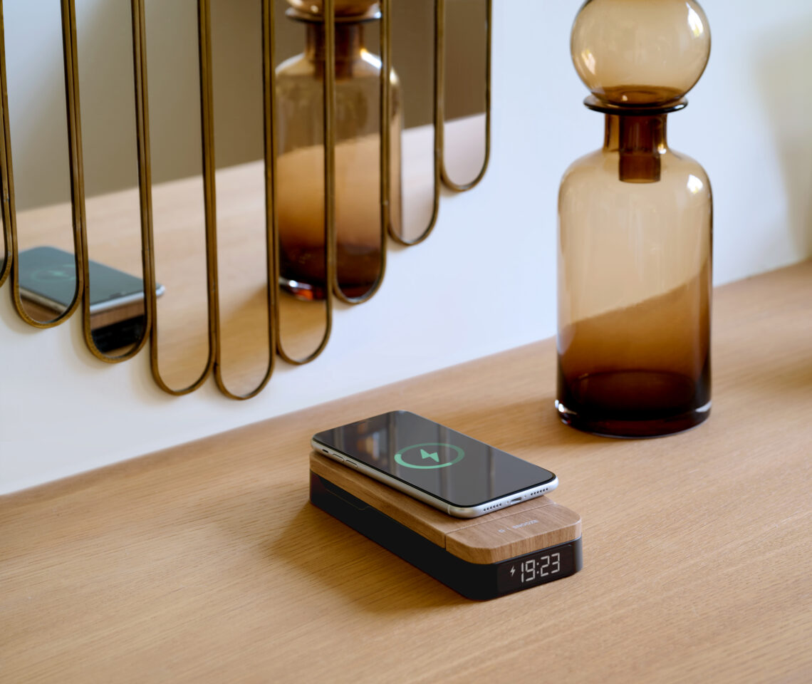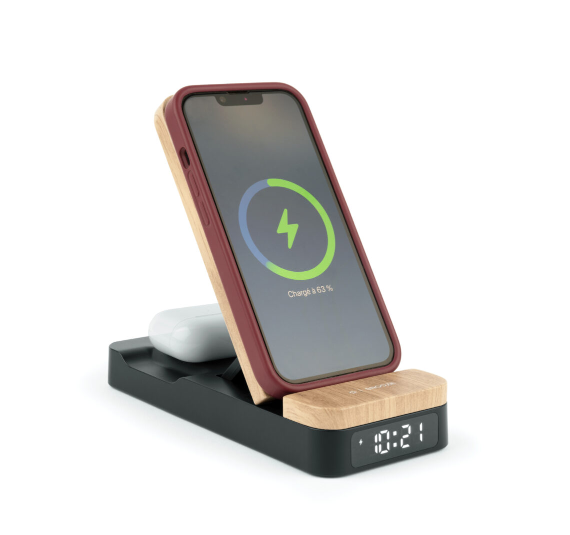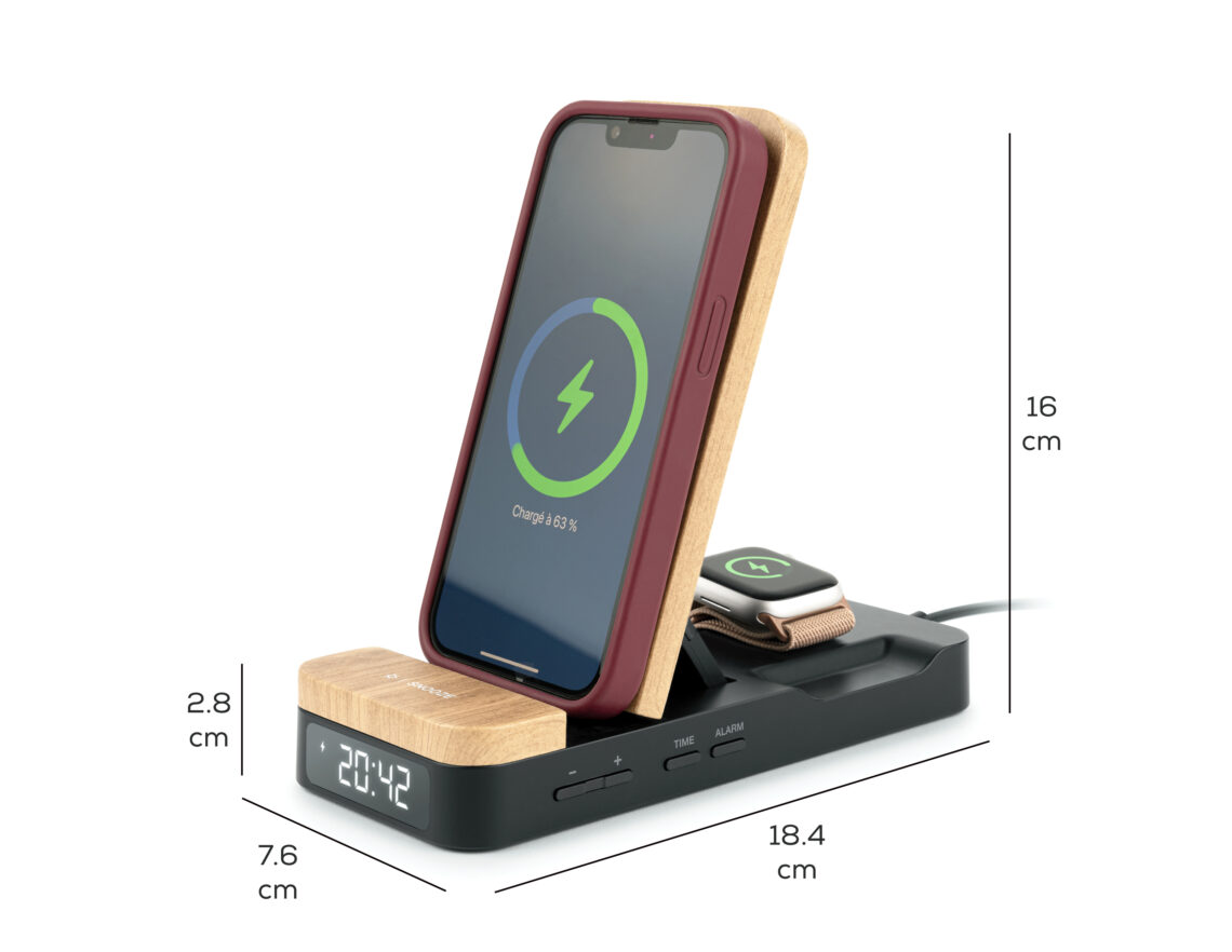 – 2 Android- und Apple-kompatible Induktionsladegeräte für Smartphone und Connected Watch.